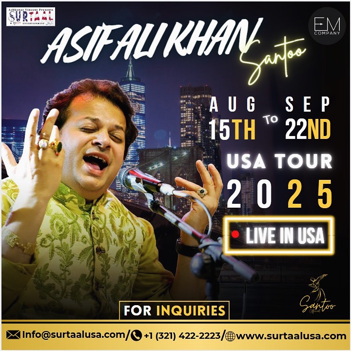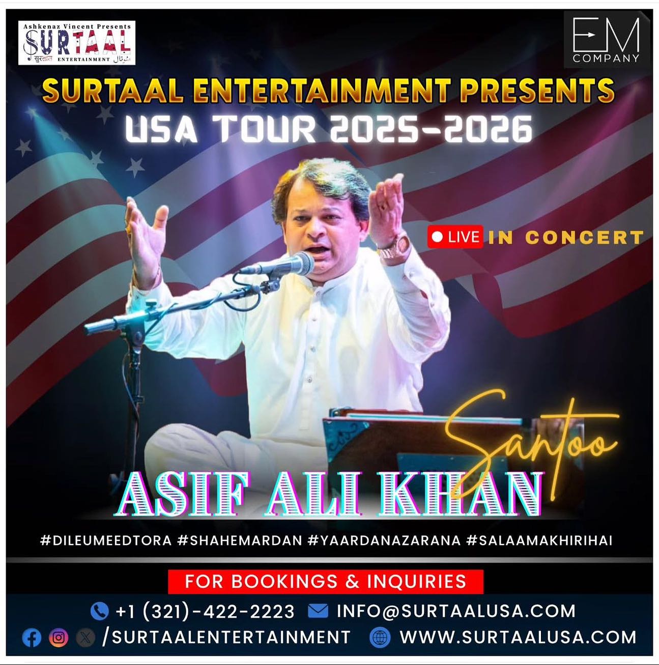 Experience the soulful magic of Asif Ali Khan Santoo, one of the most captivating voices in South Asian music today. With over 25+ successful shows across the USA in 2025, Santoo has left audiences spellbound with his powerful vocals and electrifying stage presence. His music bridges tradition and modern flair, bringing the true essence of Sufi and classical artistry to life. Whether it’s a corporate event, wedding, or grand concert, Asif Ali Khan Santoo brings unmatched energy and emotion to every stage. Now available for bookings across the USA in 2026 through Surtaal Entertainment.
